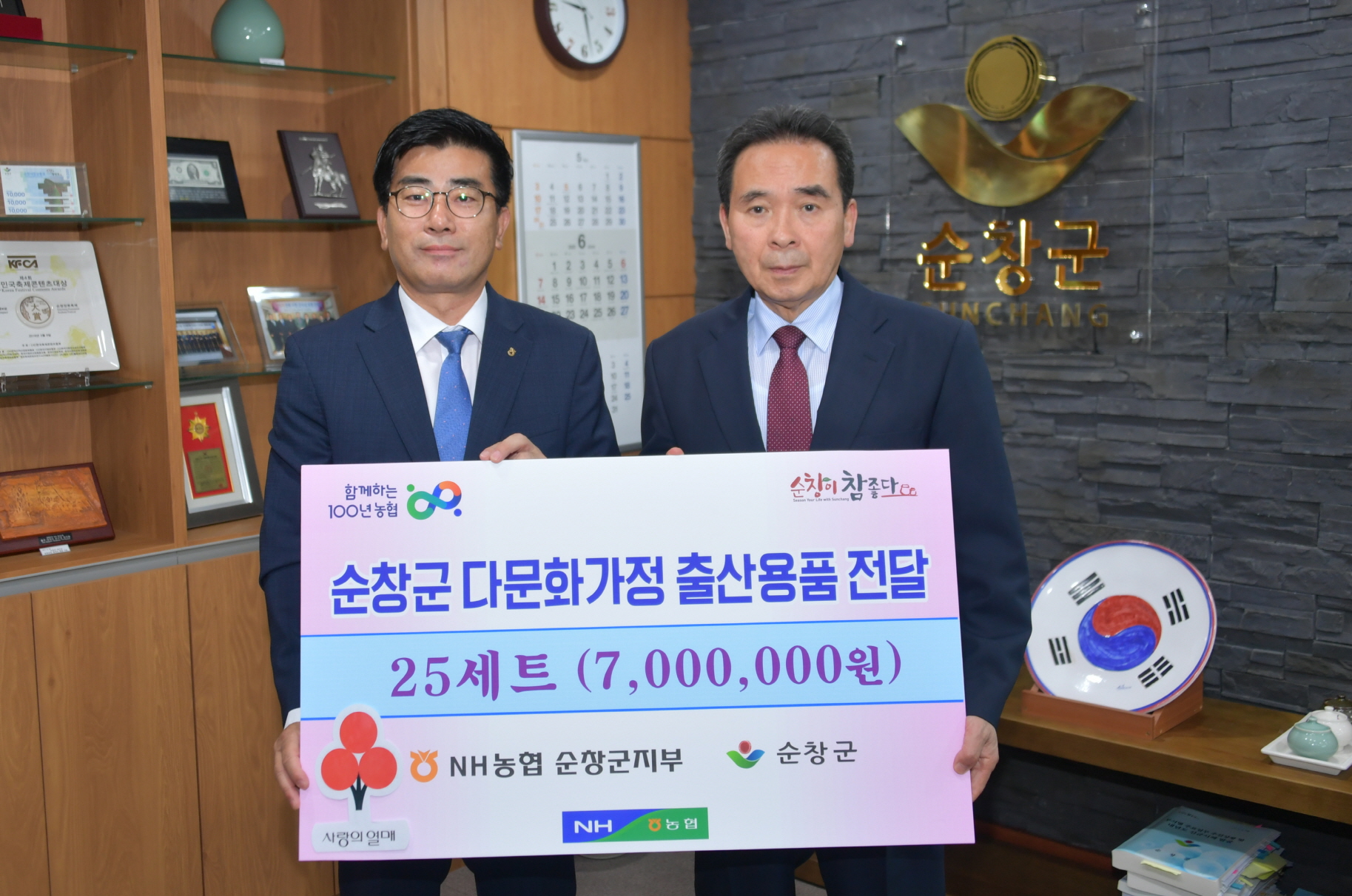 - NH농협 순창군지부(지부장 장경민)는 지난 18일 순창군청을 방문해 관내 다문화가정 출산지원에 써달라며, 700만원 상당의 출산육아용품과 위생용품을 전달했다. 이날 전달식에는 황숙주 순창군수와 장경민 농협지부장이 함께했다. NH농협 순창군지부는 다문화가정이 출산과 육아로 인해 겪는 경제적 부담을 완화시켜 지역사회에 안정적으로 정착할 수 있도록 돕고자 하는 취지에서 이번 물품전달을 마련했다고 밝혔다. 물품은 턱받이, 전동손톱깍이, 힙시트, 이유식 식기세트, 방수요, 마스크소독기 등 육아에 꼭 필요한 물품들로 구성했다. 순창군 다문화가족지원센터가 지난 2019년부터 2020년에 사이에 자녀를 출산했거나 출산 예정인 다문화가정 25곳을 선정해 물품을 전달할 계획이다. 장경민 지부장은 “이번에 지원되는 출산육아용품이 다문화가정의 육아 부담해소에 조금이나마 도움이 됐으면 좋겠다”며 “앞으로도 저출산과 고령화, 인구유출에 따른 관내 인구감소 문제에 적극적으로 동참하는 농협이 되도록 노력하겠다”고 밝혔다. 이에 황숙주 순창군수는 “관내 다문화가정에 많은 관심을 가져준 것에 대해 감사드린다”며 “군도 다문화가정이 지역에 안정적으로 정착될 수 있도록 행정적 지원을 아끼지 않겠다”고 밝혔다.