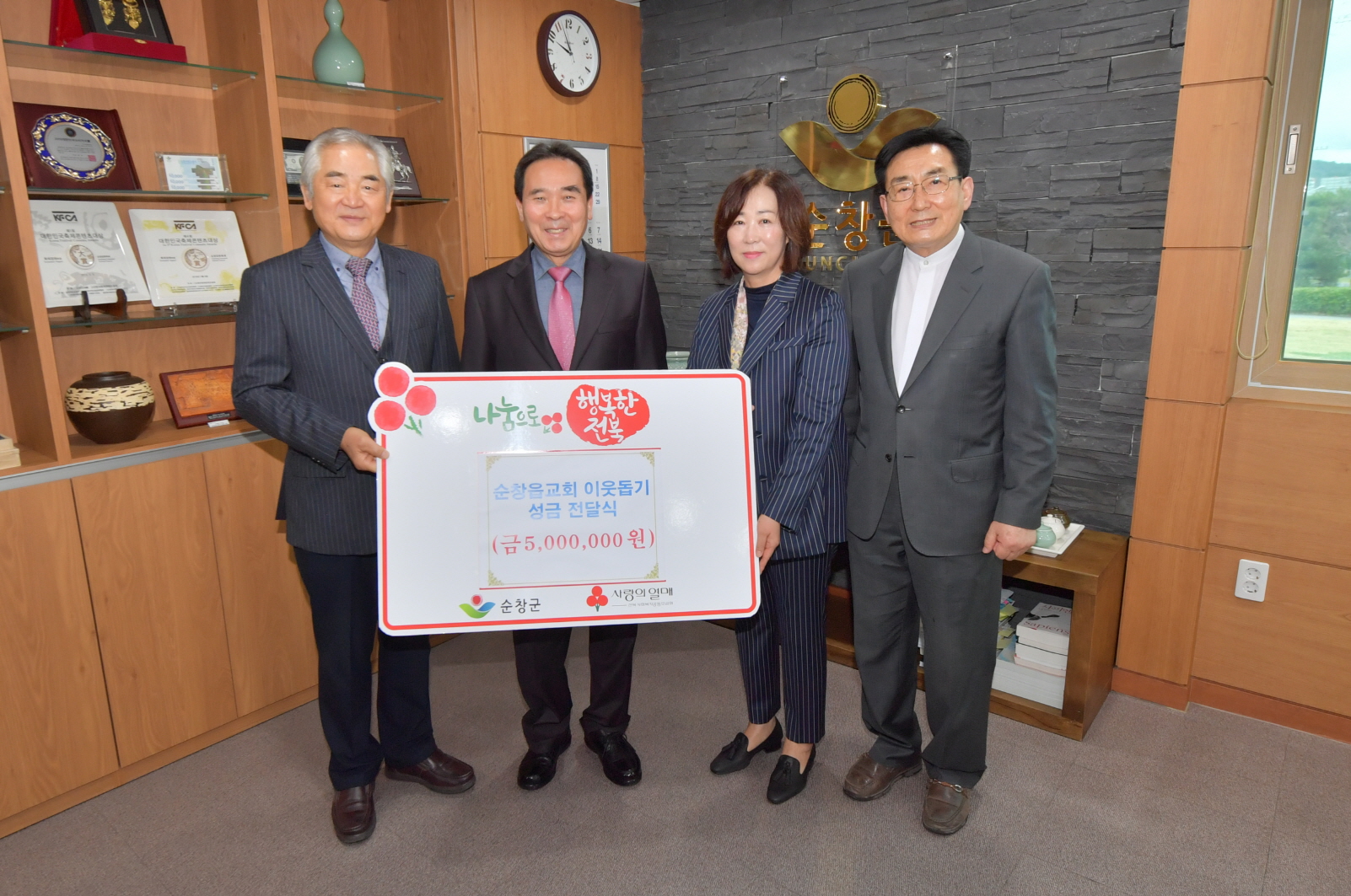 - 한국기독교장로회 순창읍교회(목사 김별배)는 지난 27일 순창군청을 방문해 관내 어려운 이웃을 써달라며, 성금 5백만원을 기탁했다. 이날 기탁식은 오전 10시 군수실에서 열린 가운데 황숙주 순창군수, 김별배 목사, 김태환 장로 등이 함께했다. 김별배 목사는 “코로나19 확산에 따른 경기침체로 지역내 소외계층의 어려움이 더해지고 있다”면서 “이번 성금이 지역내 도움이 필요한 어려운 이웃에게 잘 전달되길 바란다”고 전했다. 황숙주 순창군수는 “어려운 시기에 지역사랑의 나눔을 실천해준 순창읍교회에 다시 한 번 감사드린다”면서 “기탁된 성금은 지역내 도움이 필요한 곳에 잘 쓰여지도록 하겠다”고 말했다. 한편 한국기독교장로회 순창읍교회는 지난 1913년 설립되어 100년이 넘는 역사를 자랑하며, 장날 무료급식 봉사활동 등 지역사회에 사랑나눔 활동을 꾸준히 이어오고 있다.