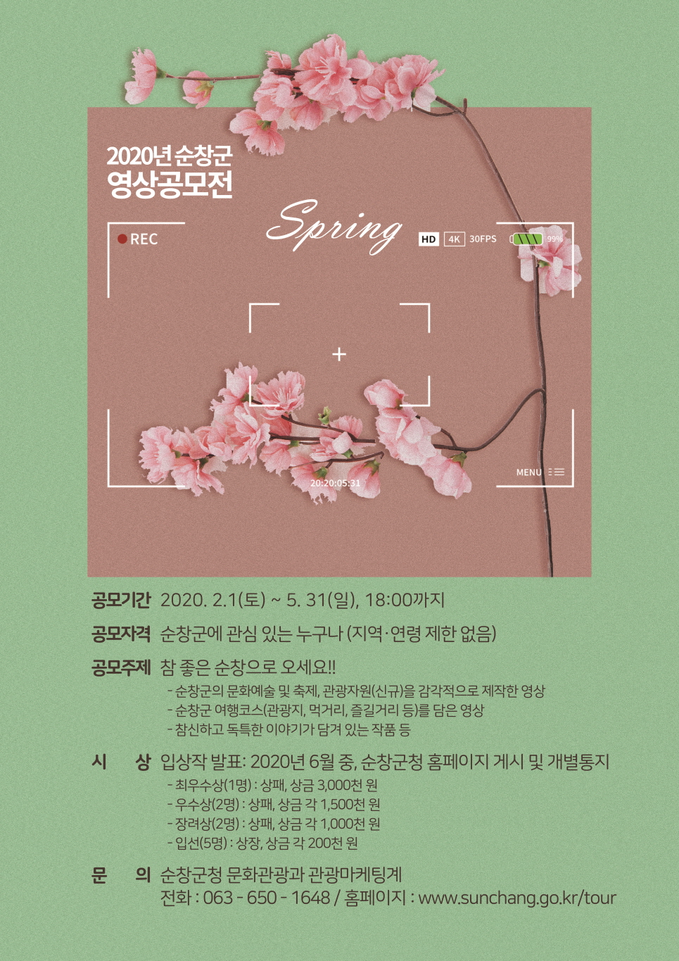 - 순창군에서는 ‘참 좋은 순창으로 오세요!!’라는 주제로 순창군 봄 영상공모전’을 개최한다. 이번 공모전은 순창군에서 주관하며 전 세대에게 흥미를 유발하고 순창군의 이미지, 인지도를 높이기 위해 추진한다. 또한, 모바일 시장의 저변확대 및 유튜브 채널의 활성화가 되고 있는 시점에 온라인 홍보의 폭도 넓히기 위해 마련됐다. 공모주제는 축제, 문화예술, 관광지, 여행코스, 먹거리, 체험농장 등 순창군의 문화관광 전반에 대한 내용 및 응모자들이 직접 기획한 참신하고 독특한 이야기 등 순창군의 이미지 향상에 도움이 되는 주제면 된다. 공모대상은 지역과 연령에 제한없이 순창군에 관심이 있는 국민 누구나 응모 할 수 있다. 참여 희망자는 오는 5월 31일까지 순창군청이나 순창군 문화관광 홈페이지에서 참가신청서를 다운받아 작성한 후 작품과 함께 방문(순창군청 문화관광과) 또는 이메일로 제출할 수 있다. 공모작품은 2∼3분의 AVI, WMV, MP4 등 동영상 파일형태인 순수창작물로 저작권, 초상권, 상표권 등의 문제가 없어야 하며 제출된 입상 작품의 모든 권한은 순창군청에 귀속된다. 공정한 심사를 거쳐 입선작 10편을 선정할 예정이며, 그중에 최우수상 1편 300백만원, 우수상 2편 각 150만원, 장려상 2편 각 100만원, 입선작 5편 각 20만원 등 총 900만원의 상금과 상장을 시상할 계획이다. 선정 작품은 6월 중 홈페이지를 통해 발표되며 다양한 행사나 홍보활동, 공식유튜브 등에서 상영하여 순창군 홍보 자료로 적극 활용할 예정이다.