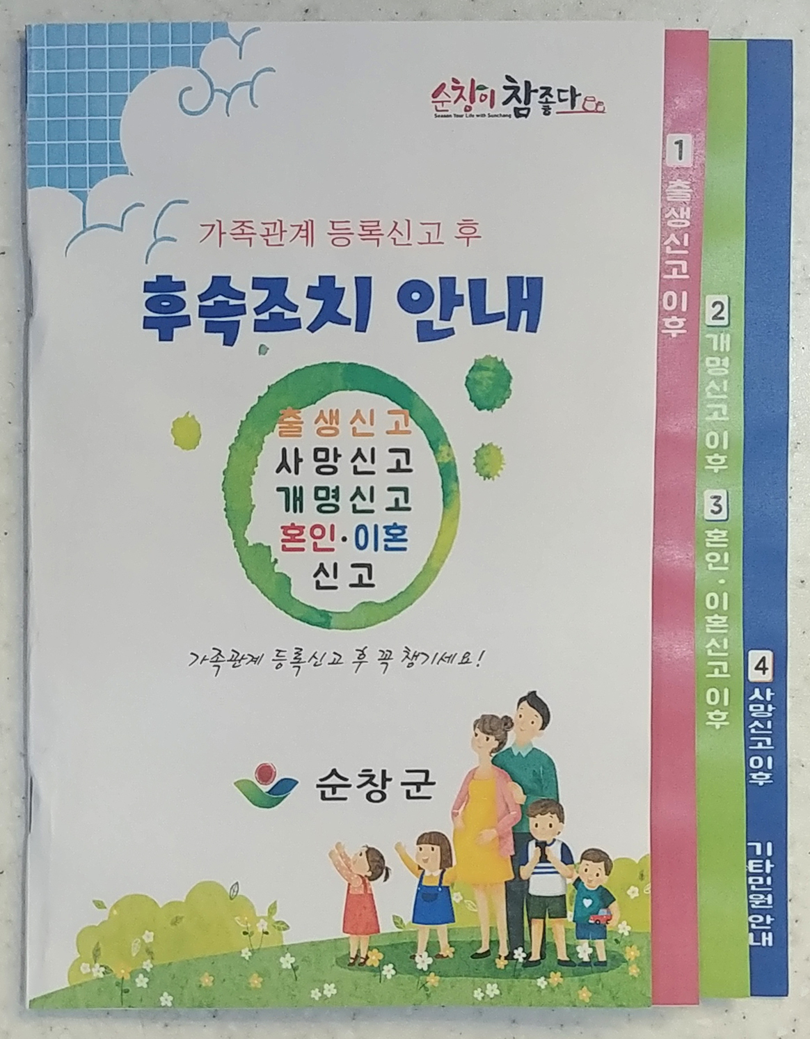 - 순창군이 민원신고사항을 주요 골자로 하는 `가족관계등록신고 길라잡이`를 1,000부를 제작.배부에 나서며 군민 편의를 도모할 예정이다. 군은 금주내로 제작을 마무리하고 각 읍면 사무소에 배부를 마무리할 계획이라고 밝혔다. 군은 이번 홍보물에 주요 4대 신고사항인 출생, 개명, 혼인‧이혼, 사망 신고 등에 관한 절차상 중요사항을 정리해 담았다. 특히 출생신고 이후 각 가정에서 지원받을 수 있는 출산장려금, 가정양육수당, 영유아 보육료 지원 등 실질적 혜택에 관한 내용도 빠뜨리지 않고 담아, 군민들이 재정적 지원을 받지 못하는 사례가 없도록 신경을 썼다. 더욱이 군을 비롯해 타 공공기관에서 지원하고 있는 다양한 지원정책에 관한 사항도 수록하며, 아이를 양육하는 부모들이 한 눈에 쉽게 알 수 있도록 제작했다. 군 관계자는 “아이를 키우는 부모들에게 지원되는 다양한 정책들을 알기 쉽게 담았다”면서 “군에서 지원하는 혜택을 받지 못하는 사례가 없도록 최선을 다하겠다”고 밝혔다.해당 게시물이 '사진으로 보는 군정'에서 이동 되었습니다.