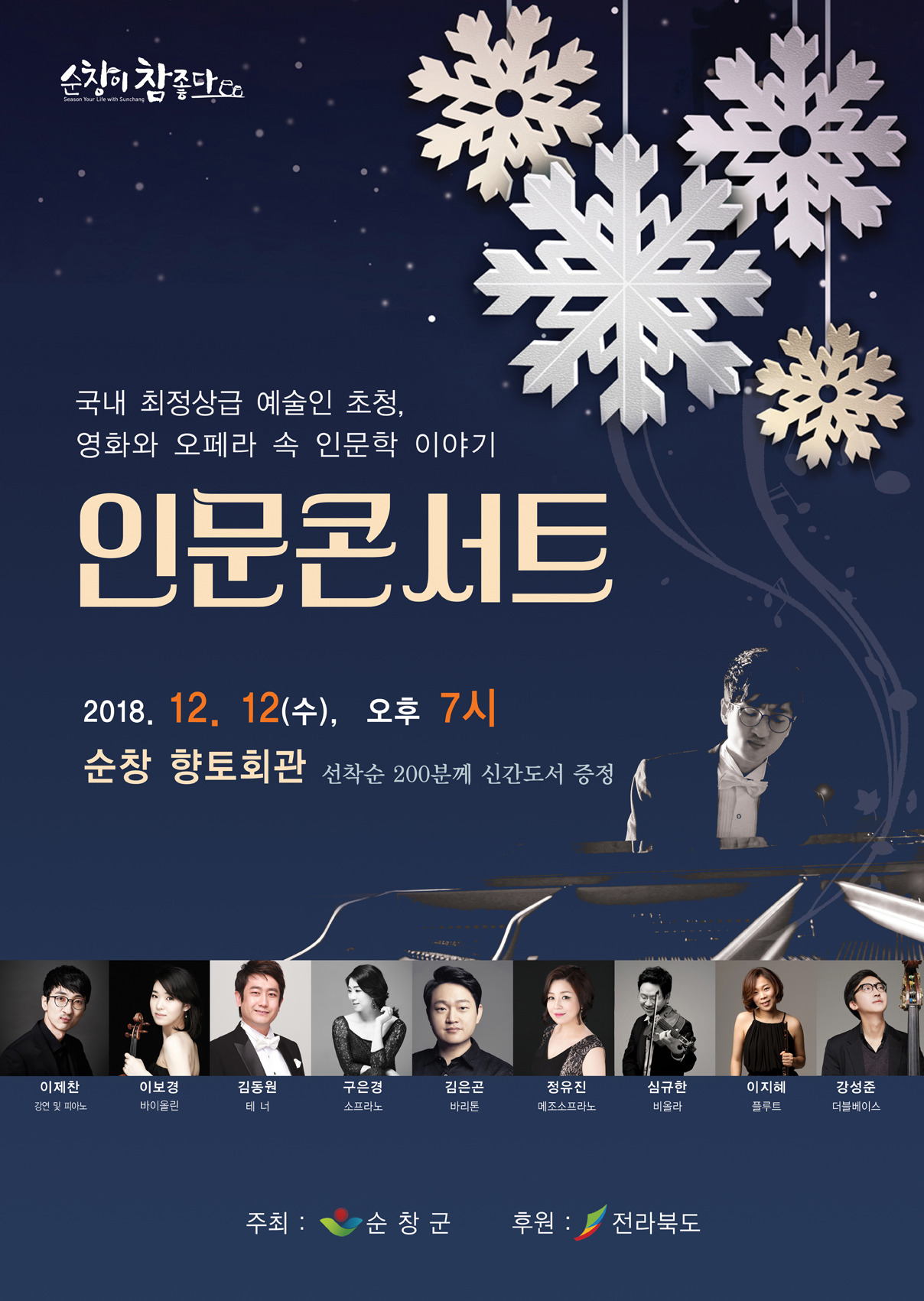 - 순창군 군립도서관이 오는 12일 저녁 7시, 향토회관에서 영화와 오페라가 담고 있는 삶을 책과 함께 이야기하는 「2018 인문콘서트」를 개최한다. 이번 행사에는 피아니스트 이제찬을 비롯해 국내 최정상급 연주자들을 초청한다. 이제찬은 파리국립고등음악원을 졸업하고 리베아트센터 예술감독 및 LAYO 지휘자로 활발한 연주활동을 벌이고 있으며, 특히 클래식 음악과 인문학을 주제로 150여회가 넘는 콘서트를 운영했다. 초청연주자인 바이올리니스트 이보경은 ‘따뜻하고 마음을 움직이는 연주자’로 윤이상 콩쿠르 1위 및 모스크바 필하모닉, 뮌헨 쳄버 오케스트라와 함께 연주하는 등 국내외에서 뛰어난 연주력을 인정받았다.1부에서는 와 같이 우리에게 잘 알려진 영화에서 ‘전세계를 울린 위대한 사랑’과 오펜바흐의 ‘뱃노래’가 어떤 역할을 하는지 되짚어 본다. 2부에서는 비제의 오페라 카르멘을 비롯해 헨델과 베르디 등 친숙한 곡들을 감상할 수 있다.순창군립도서관은 이번 콘서트가 일상 속에 색채와 향기를 더해 지역문화의 역량과 군민들의 긍지를 높이는 데 보탬이 되기를 기대하고 있다.또 참석자들 200명에게 신간도서를 선물로 증정하기로 했다. 이와 관련한 자세한 내용은 전화(650-5678)로 문의하거나 순창군립도서관 홈페이지(lib.sunchang.go.kr)를 통해 안내받을 수 있다.해당 게시물이 '사진으로 보는 군정'에서 이동 되었습니다.