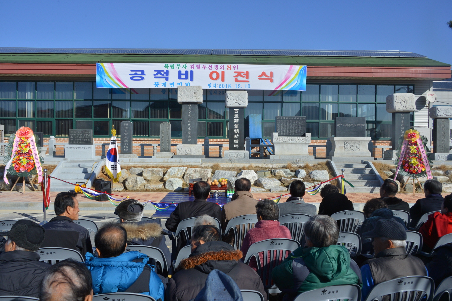- 순창군 동계면에서는 지난 10일, 특별한 행사가 열렸다. 동계면 여기저기에 산재되어 있는 공적비를 면사무소 앞 양지바른 곳에 모아 비석거리를 조성해 동계면민 모두가 본받을 수 있도록 한 것이다. 이날 행사에는 황숙주 군수와 정성균 군의장, 동계면 유관기관 단체장 등 150여명의 주민이 참석한 가운데 성대하게 진행됐다. 이번에 이전된 공적비는 동계면민들의 화합분위기 조성과 지역사회 발전은 물론 인재육성을 위해 헌신하여 동계면 발전에 앞장선 분들의 공적비다. 특히 독립투사 추산 김일두 선생은 1891년 동계면 추동마을에서 태어나 17세에 의병에 가담해 소대장이 되어 왜병을 무찔렀으며, 상해 임시정부 조직내 대한유생독립단을 조직해 일본군에 치명타를 가했다. 이후 왜병에 체포돼 서대문형무소에서 옥고를 치르다 1955년 65세를 일기로 생을 마감했다. 현재는 국립현충원에 안장되어있고 전주 덕진공원에도 선생의 공적비가 있다.또한, 경초 김재호 선생은 젊어서 넓은 외지로 진출해 큰 사업인 호남여객 운수업을 이루고 고향사랑에 많은 지원을 했으며, 그 외 서암 정만조 선생 등 총 8명의 공적비를 이전했다. 황숙주 순창군수는 “이번 공적비 조성을 통해 그동안 국가와 민족을 위해서 헌신한 독립운동가와 고향을 사랑하는 마음으로 기부하고 봉사한 8명의 고귀한 뜻이 후손들에게 길이 전해질 것”이라고 말했다.또한, 양상구 동계면장은 “그동안 잘 관리가 되지 않았던 공적비들을 한데 모아 비석거리를 조성한 것은 매우 뜻 깊은 일”이라면서 “앞으로도 동계 발전을 위한 동계면민들의 화합과 지역사랑을 위해 더욱 앞장서겠다”고 말했다.해당 게시물이 '사진으로 보는 군정'에서 이동 되었습니다.