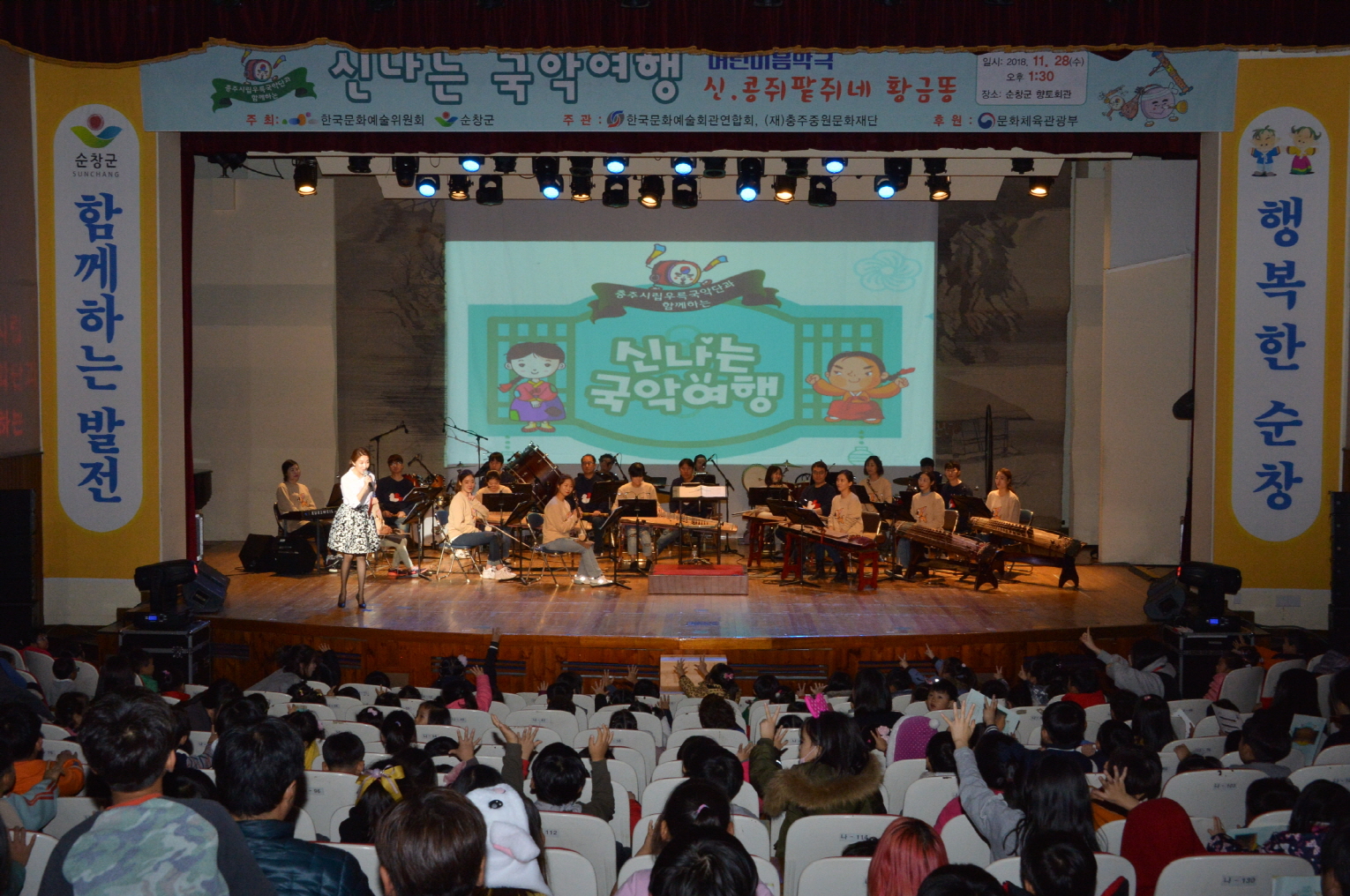 - 향토회관에 모인 아이들 얼굴에 웃음꽃이 피었다.순창군은 지난 28일 향토회관에서 `어린이 음악극 신. 콩쥐팥쥐네 황금똥` 공연을 관내 어린이집 유아와 초등학생 400여명이 참여한 가운데 진행했다. 이번 공연은 `방방곡곡 문화공감사업`으로 한국문화예술위원회와 순창군이 주최하고 한국문화예술회관연합회와 재단법인 충주중원문화재단이 주관해 전통국악 공연과 함께 마술공연 등도 펼쳐졌다.태동의 박동감과 시작에 대한 기대를 무용곡풍으로 표현한 국악관현악 서곡 “청”의 공연을 시작으로 아이들에게 국악기 소개도 이어져 처음 보는 국악기에 대한 호기심을 해소하는 시간을 가졌다. 또한 참여한 관객 대다수가 유아와 초등학생인 점을 감안해 인기리에 방영되는 애니메이션 4곡을 선별해 공연장을 찾은 아이들과 함께하는 시간도 마련했다.어린이 음악극 공연을 끝으로 1시간 30분가량 이어진 공연을 마무리했다. 이날 어린이들을 인솔한 김모씨는 “그 동안 주로 성인 위주의 공연으로 아이들 대상 공연이 부족했는데 지난 7월에 이어 오늘 공연도 아이들에게 유익한 시간이 되었다”고 만족감을 드러냈다.노홍균 문화예술계장은 “군은 지난 6월과 7월에 이어 이번에도 어린이와 청소년들을 위한 공연을 유치해 다양한 계층에게 맞춤형 문화공연을 선보였다”면서 “내달 24일에는 청소년을 위한 페스티벌도 준비하고 있어 청소년들의 많은 관심을 바란다”고 당부했다.해당 게시물이 '사진으로 보는 군정'에서 이동 되었습니다.