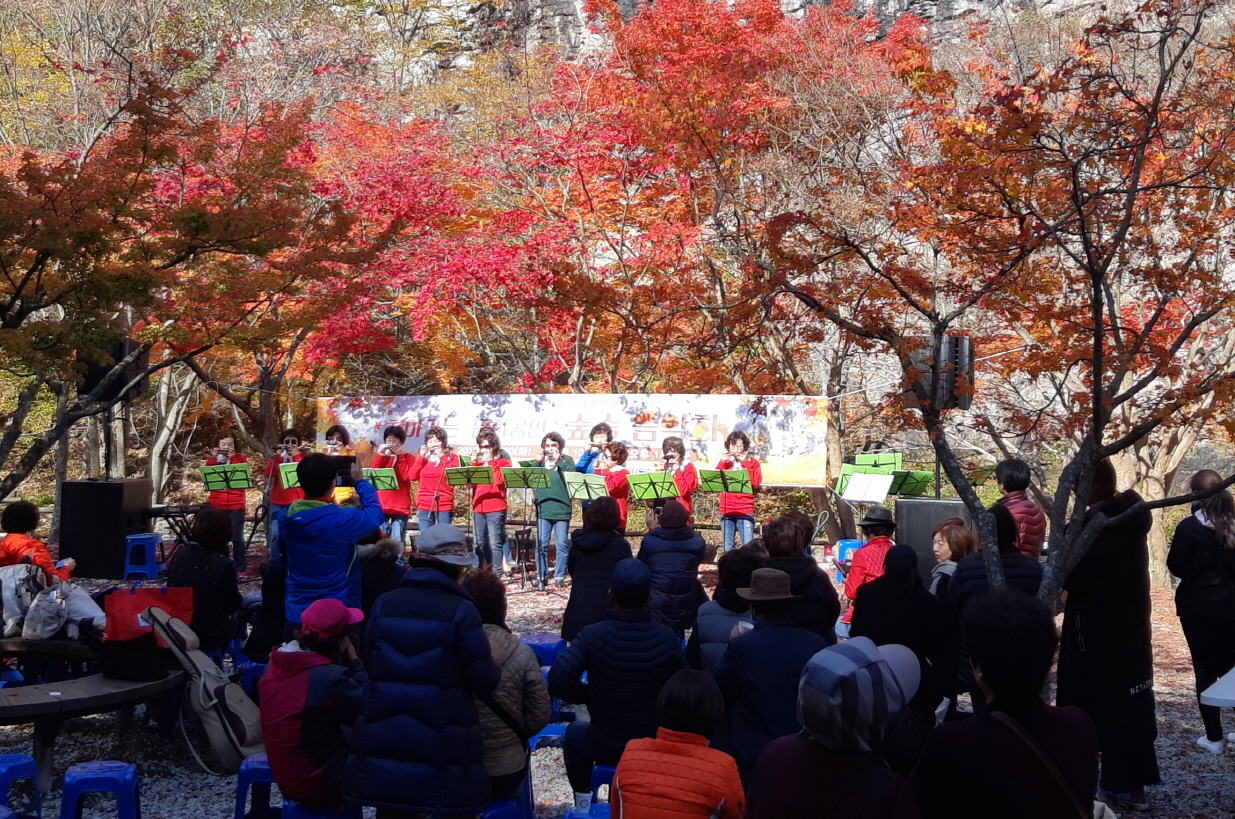 - `숲속 음악회`가 지난달 30일 강천산에서 진행돼 등산객들에게 즐거움을 선사했다.이번 음악회는 순창군이 후원하고 (사)순창군생활문화예술동호회(이하 동호회,회장 최종섭) 주관으로 강천산 병풍폭포 앞에서 일 2회에 걸쳐 진행됐다. 순창 강천산은 년 관광객 1백만명 이상이 찾는 순창을 대표하는 관광지로 호남의 소금강이라고도 불린다. 특히 병풍폭포는 병풍을 드리운 아름다운 폭포로 강천산의 대표적 포토존으로 자리매김 하고 있는 곳이다. 이날 행사에는 순창군생활문화예술동호회 6개팀 30여명이 공연을 펼쳐 단풍철을 맞아 강천산을 찾은 등산객들에게 아름다운 음악공연을 선사했다. 공연장을 찾은 등산객들은 하모니카의 아름다운 선율과 병퐁폭포에서 떨어지는 물소리에 잠시나마 눈을 감고 감상에 젖었다. 특히 하모니카 동호회는 한국문화예술회관연합회에서 주관하는 문화예술 교육프로그램 지원사업에 선정돼 지난 4월부터 매주 1회에 걸쳐 교육을 진행해 순창군을 대표하는 동호회로 자리매김 하고 있다.이날 행사장을 찾은 최종섭 회장은 “순창을 대표하는 관광지에서 동호인들이 공연을 할 수 있어 뿌듯했다”는 소감을 전했다.한편 순창군생활문화예술동호회는 요양원 등 소외계층을 찾아 공연을 추진하는 재능기부 활동도 꾸준히 펼치고 있으며, 지난달 31일까지 군청과 순창고등학교 로비 등에서 동호회 회원들의 200여개 작품 전시활동도 진행했다.해당 게시물이 '사진으로 보는 군정'에서 이동 되었습니다.