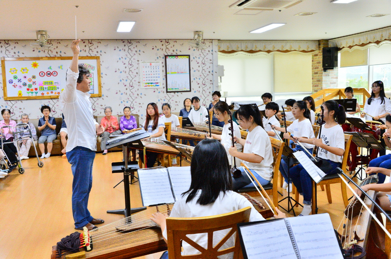 - 다문화와 비 다문화 청소년들의 아름다운 하모니 ‘무지개 국악오케스트라’의 아름다운 연주가 순창노인전문요양원 어르신들의 마음까지 따뜻하게 보듬었다.군은 지난 20일 순창노인전문요양원에서 ‘무지개오케스트라’단의 찾아가는 연주회가 진행됐다고 밝혔다. 이번 연주회는 지난해 창단한 무지개 오케스트라단이 창단 1주년을 맞이해 시작한 첫 번째 연주회로 지역 요양시설을 찾아 의미를 더했다.이날 연주회에는 10명의 무지개오케스트라단원들이 참석했으며 아리랑, 아름다운 나라, 오나라, 흥부와 놀부, 산도깨비, 신모둠 등을 연주해 어르신들의 얼굴에 환한 웃음꽃이 피어 올랐다.이번 연주회에 참여한 학생은 “아직 서툴지만 우리가 열심히 연습한 음악들이 할머니 할아버지의 마음을 기쁘게 해준 것 같아 기쁘다”고 소감을 밝혔다.황숙주 군수도 공연현장을 찾아 “일년 만에 이렇게 성장한 무지개오케스트라 단원들을 보니 마음이 뿌듯하다” 면서 “앞으로 무지개 오케스트라단이 장류축제 등 지역 행사에서 다양한 역할을 할 수 있도록 지원해 나가겠다”고 말했다. 한편 무지개오케스트라는 다문화청소년들에게 전통예술 교육 및 국악연주 기회를 제공해 문화동질성을 추구하고 지역공동체 구성원으로 성장할 수 있도록 지원한 공공예술프로젝트로 전북도립국악원과 순창군, 순창교육지원청이 지난해 창단했다. 해당 게시물이 '사진으로 보는 군정'에서 이동 되었습니다.
