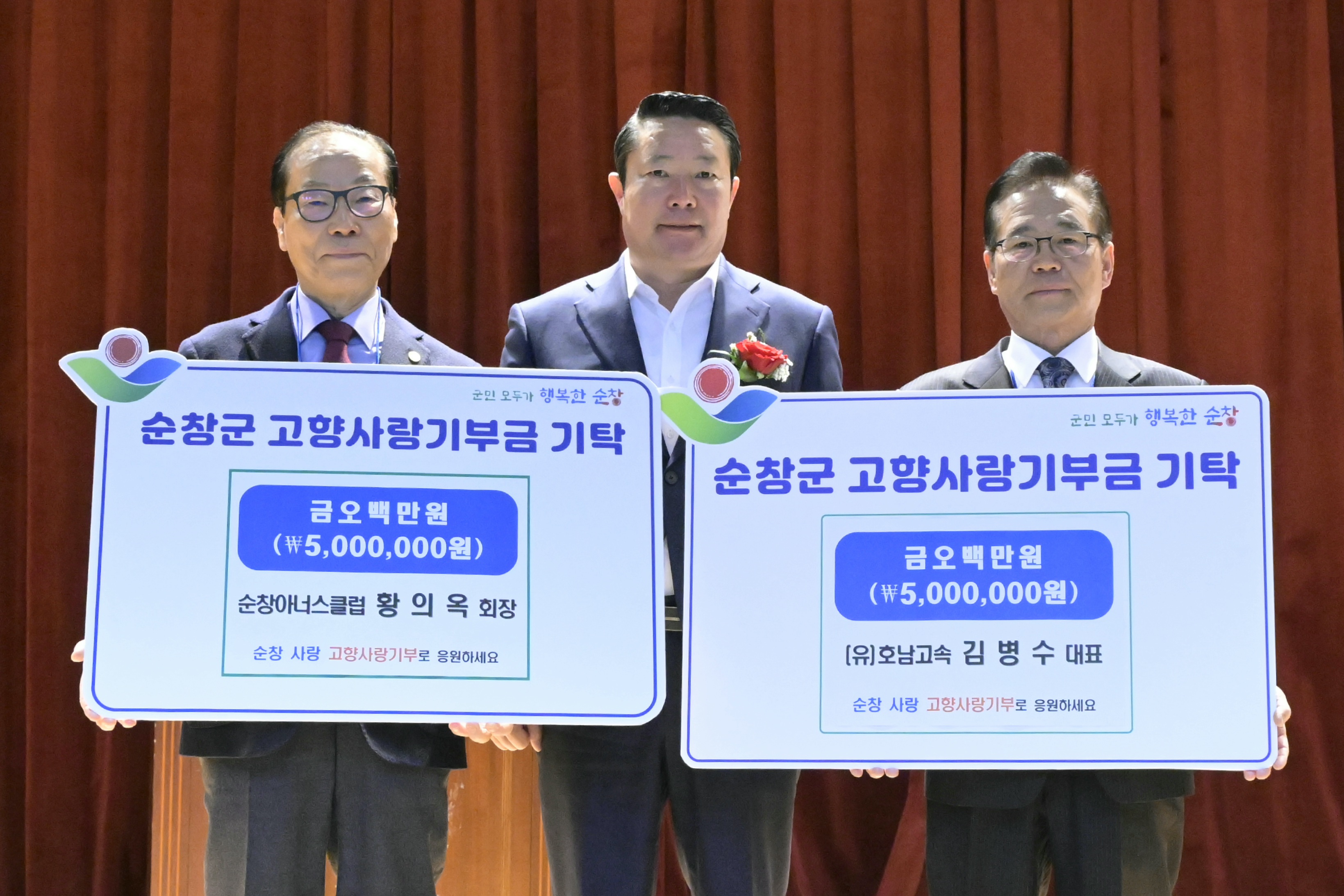 - 순창군은 고향사랑기부제 확산과 지역 발전을 위해 황의옥 순창아너스클럽 회장과 김병수 호남고속 대표가 3년 연속으로 고향사랑기부금 500만 원을 각각 기탁했다고 24일 밝혔다. 황의옥 회장은 순창군 동계면 출신으로, 고향사랑기부제가 시행된 2023년부터 매년 500만 원을 꾸준히 기부해 오며 변함없는 고향사랑을 실천하고 있다. 또한, 2023년 9월 창립된 순창군 고액기부자 모임‘순창아너스클럽’의 초대 회장을 맡아 단순한 기부를 넘어 도농교류와 지역사회 발전을 위한 협력 기반 조성에도 앞장서고 있다 김병수 대표 역시 동계면 출신으로, 고향사랑기부제가 시행된 이래 3년 연속 500만 원을 기탁했다. 특히 이번 기탁은 김 대표가 재전동계면향우회장 임기를 마무리하고 차기 회장에게 이임하는 자리인‘2025년 재전동계면향우회 정기총회 및 신년인사회’에서 이뤄져 더욱 뜻깊은 기부로 평가받고 있다 황의옥 회장은“고향을 사랑하는 애틋한 마음을 이어가고 싶다”며,“앞으로도 순창의 발전을 위해 앞장서며, 순창아너스클럽이 고향 발전의 가교 역할을 할 수 있도록 노력하겠다”고 말했다. 김병수 대표는“많은 향우회원들이 함께한 자리에서 고향사랑의 마음을 전할 수 있어 더욱 기쁘다”면서,“오는 4월 26일 용궐산에서 전북도민일보와 순창아너스클럽이 공동 주최하는‘제2회 순창 섬진강 트레일레이스’에 적극적으로 참여해, 고향사랑기부제를 통해 고향 발전에 더욱 힘을 보태자”고 순창사랑의 애틋함을 전했다. 최영일 순창군수는“매년 변함없는 고향사랑을 몸소 실천해 주시는 황의옥 회장님과 김병수 대표님께 깊이 감사드린다”면서,“보내주신 따뜻한 마음을 원동력 삼아,‘군민 모두가 행복한 순창’을 만들기 위해 최선을 다하겠다”고 화답했다.
