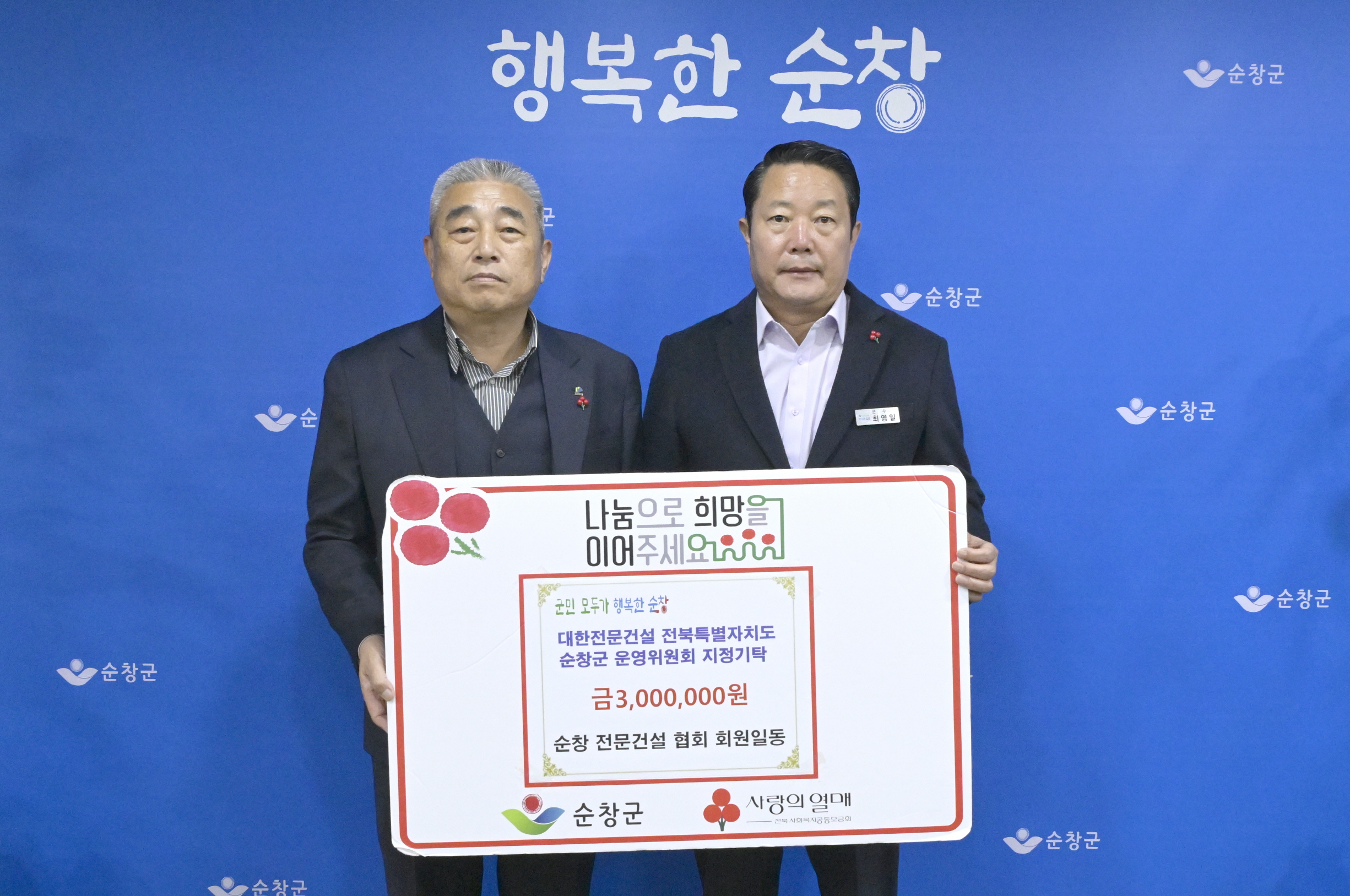 - 순창전문건설협회(오춘두회장)는 연말연시를 맞아 순창군청을 방문해 희귀난치병을 앓고 있는 관내 학생을 위해 성금 300만원을 기탁했다. 이번 성금은 순창전문건설협회 회원들이 회의를 통해 결정됐으며, 지역사회에 대한 사회적 책임을 다하고자 마련됐다. 오춘두 회장은“지역사회의 어려운 이웃들을 돕는 것은 우리 협회의 중요한 사회적 책임”이라며“이번 성금이 힘든 상황에 있는 학생에게 작은 희망과 용기가 되길 바란다”고 전했다. 최영일 군수는“이러한 나눔의 정신이 순창의 따뜻한 공동체 문화를 만들어가는 데 큰 힘이 될 것”이라며“앞으로도 우리 지역의 미래인 청소년들을 위해 지속적인 관심 부탁드린다”고 전했다.