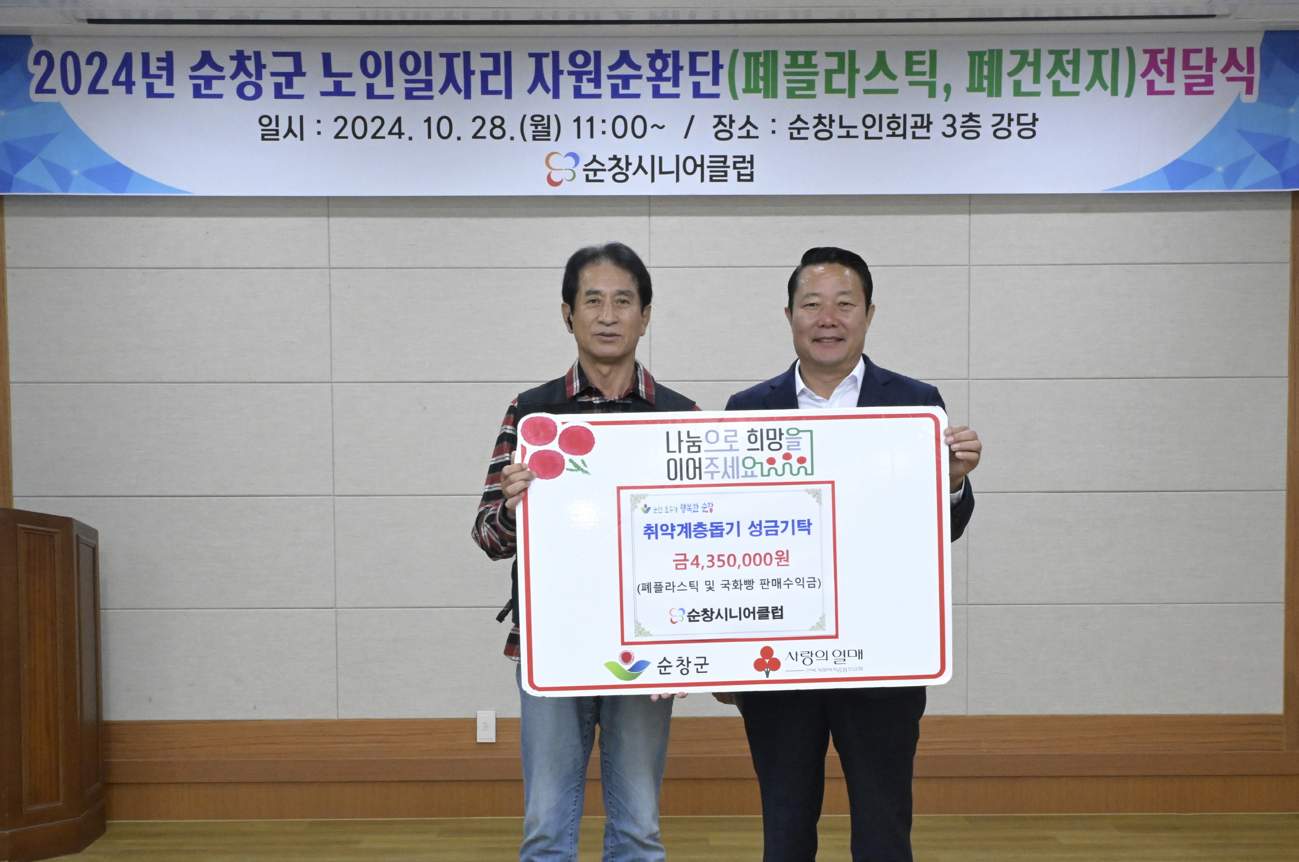 - 순창군의 역점 시책인 노인일자리사업이 어르신들의 활기찬 노후생활에 큰 힘이 되는 가운데, 여기에 참여 어르신들의 뜻깊은 나눔까지 더해져 지역사회를 훈훈하게 하고 있다. 군은 올해 공익형 2,085명, 사회서비스형 718명, 시장형 100명 등 총 2,933명의 어르신들에게 일자리를 제공하는 등 의미 있는 성과를 거두고 있으며, 특히 자원순환단과 같은 환경 분야 일자리를 확대해 어르신들의 소득 창출은 물론 지역 환경개선에도 기여하고 있다. 이런 가운데 28일 순창군 노인회관에서 열린 노인일자리 참여자 간담회에서는 뜻깊은 기부식이 진행됐다. 이날 간담회에는 최영일 군수와 손종석 순창군의회의장, 김인 한국인력개발원 전북지역본부장을 비롯해 자원순환단과 폐건전지 수거 사업 참여자 등 110여 명이 함께했다. 이 자리에서 노인일자리 참여자 대표 유영갑(68세), 임점락(74세) 어르신은 최영일 군수에게 435만원의 수익금과 건전지 1,000개를 기탁했다. 기탁된 수익금은 자원순환단이 폐페트병을 가공·판매해 얻은 331만원과 시니어클럽이 순창장류축제에서 국화빵을 판매한 수익금 103만원으로 구성됐다. 여기에 폐건전지 수거 활성화 지원사업단 어르신들이 11개 읍·면 전역에서 수거한 폐건전지 1,000개도 함께 전달됐다. 최영일 군수는“노인일자리 사업이 지역의 환경을 깨끗이 가꾸고 탄소저감에 기여할 뿐만 아니라, 이렇게 수익금까지 지역사회에 환원하는 모습에 깊이 감동했다”면서“앞으로도 어르신들의 건강과 행복을 위해 노인일자리 사업이 더욱 활성화될 수 있도록 적극 지원하겠다”고 말했다. 한편, 순창군 노인일자리사업은 어르신들의 경제활동 참여 기회를 확대하고 건강한 노후생활을 지원하는 동시에 지역발전에도 기여하며 일석이조의 효과를 거두고 있어 높은 평가를 받고 있다.