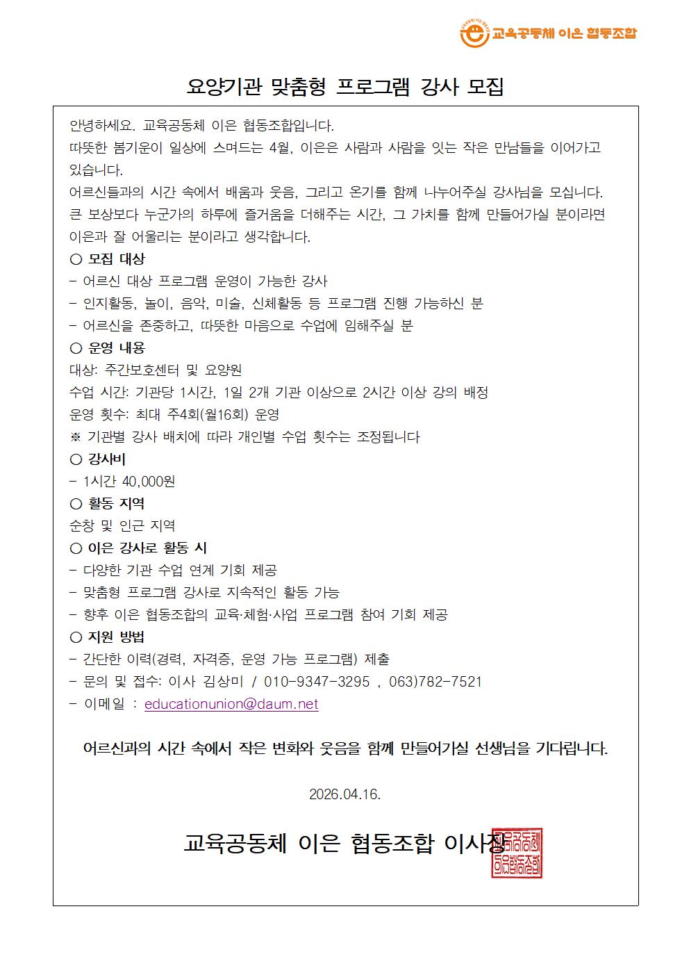 시니어 프로그램으로 흥~이 있으시고, 어르신에 대한 따뜻한 마음과 열정이 있으신 선생님을 찾습니다.