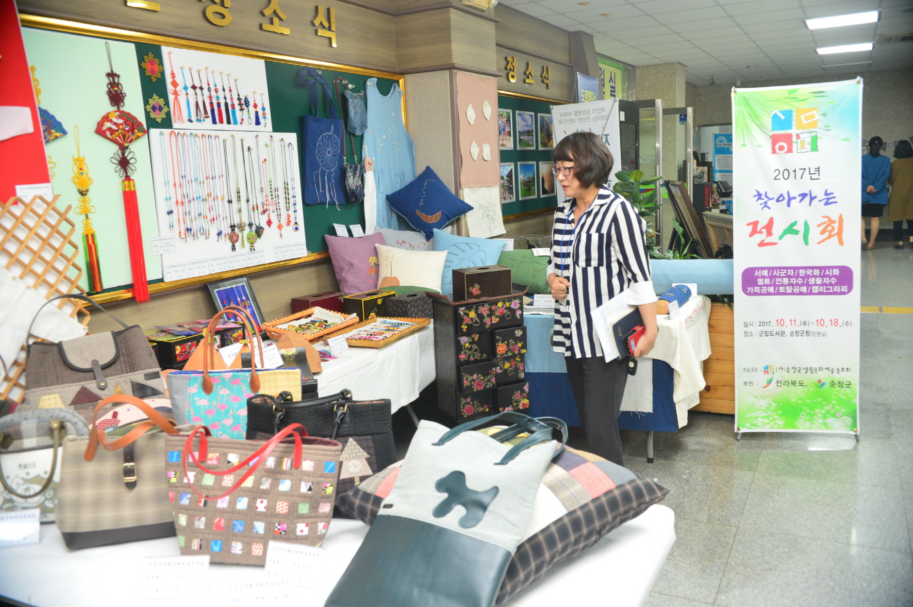 - 순창군 생활문화예술동호회(회장 최종섭)는 19일까지 ‘2017 찾아가는 전시회’를 개최한다. 이번 전시회는 회원들이 1년동안 갈고 닦은 다양한 작품을 군립도서관과 순창군청 민원실 2곳에 전시해 관심을 모았다. 지난 11일부터 16일까지는 군립도서관에, 17일부터 19일까지는 군청 민원실 앞 공간에 전시하고 있다. 작품은 한국화, 사군자, 서예, 전통자수, 생활자수, 가죽공예, 퀼트, 시화, 켈라그라피 등 150여점으로, 10개 단체가 참여해 완성도 높은 작품들을 전시했다. 생활문화예술동호회는 지난 2012년부터 매년 작품전시회를 열고 주민들에게 볼거리를 제공하고 있다. 군청 민원실을 찾았던 한 주민은 “민원실에 서류를 발급받으러 왔는데 갑자기 생각지도 못한 작품들이 전시되어 있어 놀랐다”면서 “회원들이 만든 작품이라고 느껴지지 않을 정도로 굉장히 수준급이었다”고 전했다. 최종섭 회장은 “생활문화예술동호회는 주민들 누구나 참여할 수 있는 열린 공간이다”면서 “회원들이 그동안 정성껏 만든 작품들이기 때문에 하나하나가 매우 소중한 만큼 군민들이 많이 오셔서 관람하시기 바란다”고 말했다. 한편 생활문화예술동호회는 6개분과 53개 동호회가 운영하는 순창 문화예술의 대표 단체로서, 다양한 작품활동과 상설 공연 등을 통해 군민들의 문화욕구 충족에 크게 기여하고 있다. 해당 게시물이 '사진으로 보는 군정'에서 이동 되었습니다.