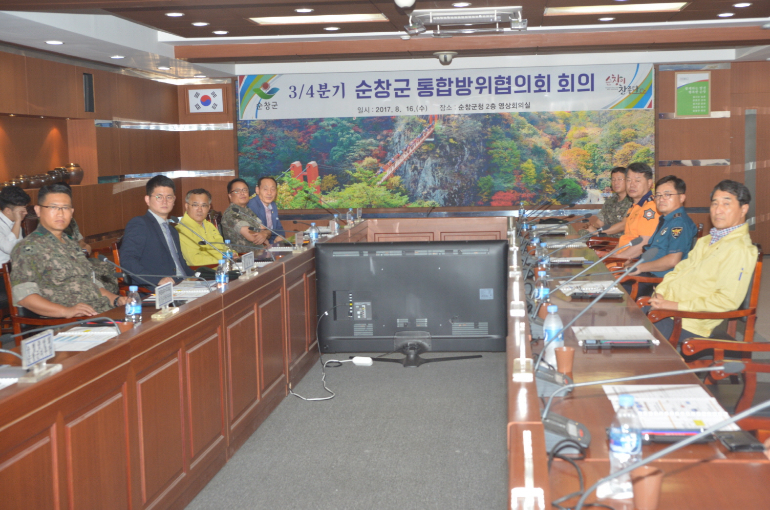 - 순창군이 지난 16일 군청 영상회의실에서 순창군 통합방위 협의회를 개최하고 2017년 을지연습의 성공적 수행을 위한 최종 점검을 마쳤다. 이날 통합방위협의회는 김종섭 군의회의장과 신일섭 순창경찰서장, 정보묵 2대대장 등 위원 16명이 참여했다. 통합방위협의회는 김종섭 군의장이 주재 했으며 최근 엄중해 지고 있는 한반도 안보상황 등에 대한 동영상 시청과 2017년 을지연습 준비상황보고, 군부대 을지연습 상황에 대한 보고 등으로 진행됐다. 통합방위협의회 위원들은 이번 을지훈련을 실제 전쟁상황을 고려한 실질적 전시전환 절차 훈련이 될 수 있도록 세심하게 준비하고 민관군경이 함께 이번 훈련을 성공적으로 수행하기로 뜻을 모았다. 또 이에 따른 준비 상황도 꼼꼼히 점검했다.김종섭 의장은 “최근 북한의 미사일 도발로 한반도 안보가 매우 불안정 해지고 있다” 면서 “안보의 중요성이 더욱 강조되고 있는 상황에서 민간군경이 탄탄한 협조체계를 구축해 이번 을지연습을 성공적으로 수행하고 지역안보를 탄탄히 해 나가자”고 말했다. 해당 게시물이 '사진으로 보는 군정'에서 이동 되었습니다.