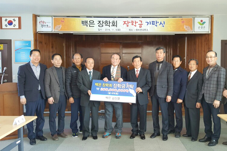 - 순창군 쌍치면 중안마을 출신인 김상열 회장(서울, 81)이 지난 6일 가정형편이 어려운 학생들을 위해 써달라며 ‘백은장학회’에 2억원의 장학금을 기탁해 지역사회에 큰 감동을 주고 있다.김상열 회장은 고향을 떠나서도 매년 고향을 위해 장학금 기탁은 물론 훈몽재 건립부지 기부, 면민회 기금 희사 등 다양한 지역사회 봉사활동을 진행해 지역민들로부터 존경을 받고 있는 인물이다.백은 김상열 회장이 기탁한 장학금 2억원은 매년 연초 쌍치면 관내 초등학교, 중학교에서 학업이 우수하지만 가정형편이 어려운 학생 2~3명을 선발하여 각 5백여만원의 장학금을 지급하는데 쓰여질 예정이다.이날 기탁식에서는 쌍치면 영광정 벚꽃나무 추진위원회에서 영광정 주변도로에 식재한 가로수 230주가 금번 국도 제29호선 도로공사에 편입되어 받게되는 가로수 이식보상비 7천만원 전액을 ‘백은 장학회’에 장학금으로 기탁해 의미를 깊게 했다.한편, 백은장학회는 지난 2015년 12월경에 백은 김상열 회장의 쌍치면 지역 인재양성을 위한 후원의 뜻에 따라 쌍치면 기관단체장, 사회단체장, 군 의원 등 10여명이 장학회 발기인 총회를 열고 이사장에 설동일 전 면민회장을 선출하여 이사 8명, 감사 2명으로 이사회를 운영하고 있다. 해당 게시물이 '사진으로 보는 군정'에서 이동 되었습니다.