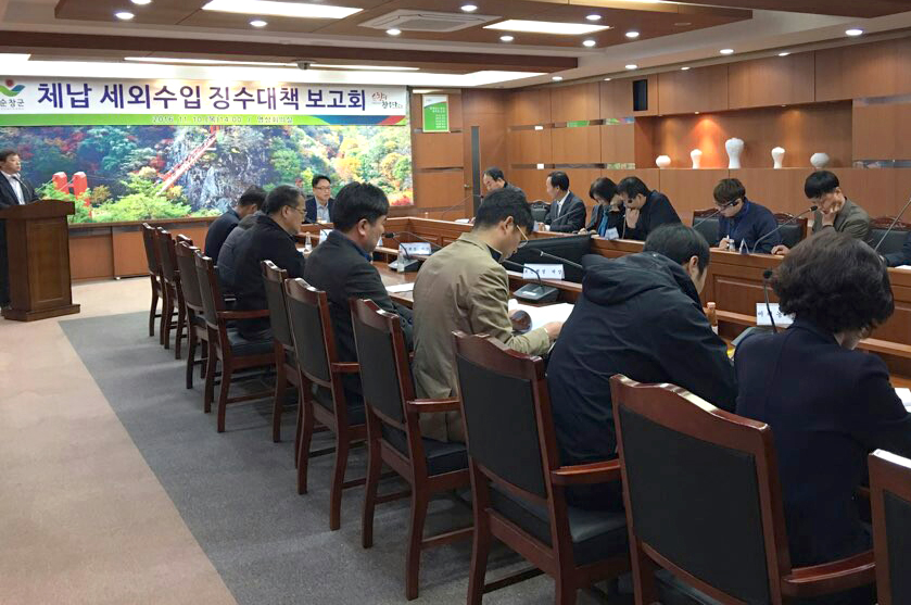 - 순창군은 11월 10일 군청영상회의실에서 신동원 부군수 주재하에 3/4분기 체납세외수입 징수실적과 체계적이고 효율적 징수를 위한 보고회를 가졌다. 이번 세외수입 징수대책 보고회는 9개부서 16명의 계장이 참석하여 개별적 체납원인과 체납징수의 문제점, 향후 일정별 추진계획 등을 보고하는 순으로 진행되었으며 체납사유를 구체적으로 분석하여 고질체납자는 번호판영치, 예금압류, 공매 등 강력한 체납처분을 추진토록 함으로써 주민의 납부의식을 높일 예정이며 특히 세외수입체납의 75%를 차지하는 새농촌육성기금에 대하여는 체납자의 관련재산을 조사하여 압류와 더불어 공매처분을 추진하고 연대보증인에 대하여도 강력한 납부촉구를 실시할 계획이다신동원부군수는 “체납징수가 어려움이 많지만 체납액 60여억원은 세입대비 많은 비중을 차지함으로 독촉장 발송, 전화독촉 등 탁상 징수가 아닌 체납자를 직접 방문하여 면담, 재산조사 등 현장중심의 체납징수가 될수 있도록 하고 금일 보고 후 사명감을 갖고 체납징수에 전력을 다하여 줄 것”을 당부했다. 해당 게시물이 '사진으로 보는 군정'에서 이동 되었습니다.