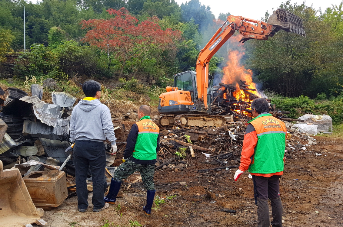 - 인계면 자율방재단(단장 한재덕)이 최근 8월 31일 쌍암마을 주택화재현장을 찾아 화재 현장 정리에 힘을 보탰다.이날 화재현장정리 활동에는 자율방재단원 40여명이 참여했으며 포크레인 작업과 함께 화재로 인한 잔재를 모아 처리하는 형식으로 진행됐다.특히 지난 20일 발생한 이번 화재 순간에도 방재단원들이 출동 했으나 좁은 골목으로 인해 소방차 진입이 어려웠고 오래된 목재 건축물 구조로 인해 화재가 급속히 번져 진압에 어려움을 겪은 방재단원들의 아쉬움은 더욱 컸다.한재덕 자율방재단장은 “재난발생을 100% 예측할 수 없지만 화재는 사람들의 부주의가 차지하는 비중이 큰 만큼 주의를 더 기울여야 한다”며, 날씨가 추워지는 만큼 화재 발생에 대한 주의를 당부했으며, 방재단 활동 현장을 찾은 한상철 인계면장은 “우리지역에 귀농해 열심히 살고자 하는 젊은 부부에게 이런 재난이 닥쳐 안타깝게 생각한다며 조금이라도 도움이 될 수 있길 바란다”며 방재단원을 격려했다. 해당 게시물이 '사진으로 보는 군정'에서 이동 되었습니다.