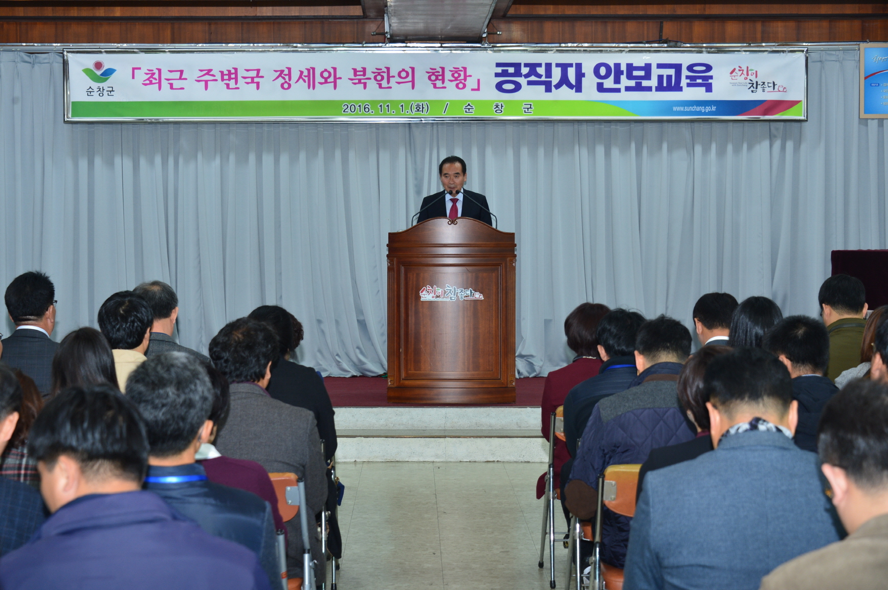 - “올해 남은기간 군민들을 위해 성과를 낼 수 있도록 마음을 다잡길 바란다”황숙주 순창군수가 지난 1일 군청 3층 회의실에서 열린 월례조회에서 올해 남은기간 성과 창출을 위해 노력해 줄 것을 주문했다.황군수는 10월 한달 동안 제11회 장류축제와 제8회 구곡순담 100세 문화 한마당 행사 등 굵직한 행사들을 성공적으로 이끈 직원들을 노력에 대해 격려했다. 또 파노라마 LED설치, 향가터널 관광자원 강화 등을 통해 향가유원지와 단풍철을 맞은 강천산에 전국에서 관광객이 몰리고 있는 만큼 관광객 맞이에도 소홀함이 없도록 할 것을 지시했다.특히 11월은 이제 한해를 마무리 하는 시간인 만큼 각자가 추진하는 사업에서 성과가 나올 수 있도록 할 것을 지시하면서 “현재 국회 예결 심사가 진행되고 있는 만큼 우리군 핵심사업이 긍정적으로 검토될 수 있도록 사전 조치 및 중앙부처 동향파악에도 노력해 달라” 고 말했다.또한 “우리나라도 생산가능인구의 감소로 경기가 침체될 수 있고 우리지역도 자유로울 수 없는 만큼 장기적 인구증대 비전을 창출 할 수 있도록 노력하자”고도 언급했다.한편 이날 월례조회에는 200여명의 직원들이 참석했으며 “최근 주변국 정세와 북한의 현황”이라는 주제로 우석대 군사정보학과 김민규 교수의 교육도 진행돼 직원들의 안보의식 고취에도 큰 도움이 됐다. 해당 게시물이 '사진으로 보는 군정'에서 이동 되었습니다.