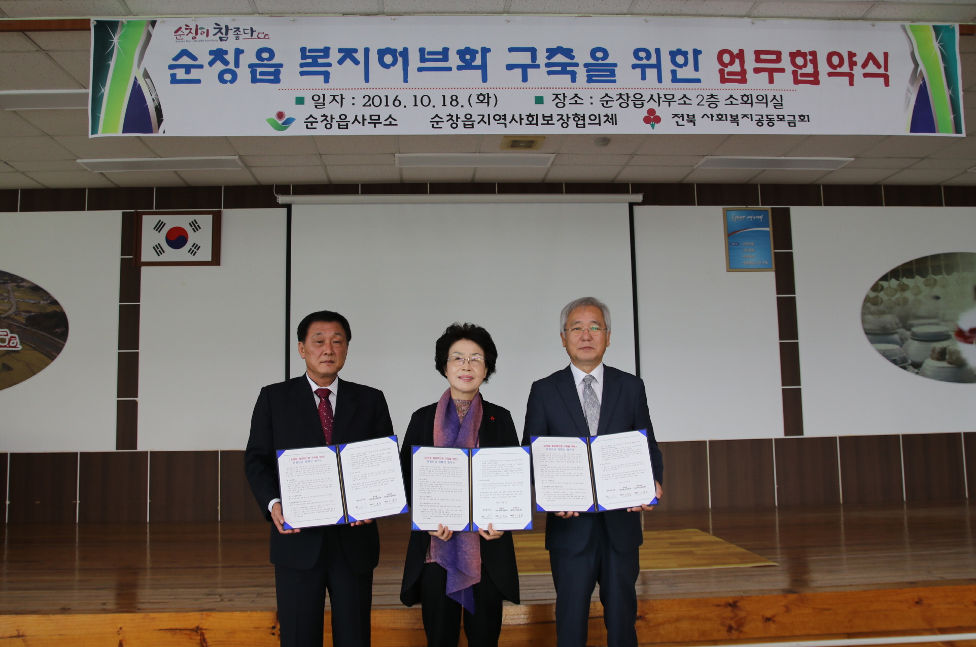 - 순창읍 지역사회보장협의체(위원장 김종국)와 순창읍, 전라북도사회복지공동모금회가 지난 18일 순창읍사무소 회의실에서 ‘순창읍 복지허브와 구축을 위한 업무협약식’을 체결했다. 협약식에는 순창읍지역사회보장협의체 김종국 위원장과, 오수환 순창읍장, 전라북도사회복지공동모금회 심정연부지회장 등 관계자 20여명이 참여했다. 이번 협약은 순창읍지역 복지사각지대에 있는 복지소외계층에게 보다 다양한 복지 지원을 목적으로 진행됐다. 특히 협의체 위원을 비롯한 지역주민들의 자발적인 참여로 기금을 모아 다양한 복지사업을 추진할 수 있는 기틀을 마련했다는데 서 큰 의미가 있다.이날 업무협약에 따라 세기관은 순창읍 복지허브화 활성화를 위해 매월 성금을 모금하고 필요한 사업을 진행해 복지사각지대 해소 및 사회안전망 구축을 위해 공동 노력하게 된다.김종국 위원장은 “협의체 위원이 나눔을 실천한 것처럼 지역사회의 많은 주민들도 나눔에 동참하길 바라며, 앞으로도 협의체는 주민이 공감 할 수 있는 복지서비스가 제공될 수 있도록 더욱 노력하겠다”고 말했다.한편, 순창읍지역사회보장협의체에서는 지난 8월 23일 출범식 이후, 관내 음식점과 자원봉사자(배달)들의 후원을 받아 순창읍지역의 결식가정에 밑반찬 지원사업을 추진 중에 있다.나눔에 동참하길 원하는 군민들은 순창읍사무소 전화 063-650-5931로 문의하면 된다. 해당 게시물이 '사진으로 보는 군정'에서 이동 되었습니다.