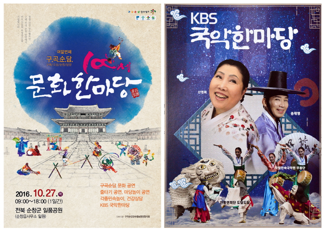 - 대한민국 대표 장수마을인 순창에서 오는 27일 100세 어르신들을 위한 제8회 구곡순담 100세 문화한마당과 KBS 국악한마당이 동시에 열려 가을에 어울리는 격조 높은 문화공연이 될 전망이다.순창읍 일품공원 야외특설무대와 주변에서 열리는 제8회 구곡순담 100세 문화한마당 행사는 구례, 곡성, 순창, 담양, 장수벨트 지역 어르신들을 모시고 경로효친 사상을 되새기고 어르신들의 노고에 보답하는 다양한 문화행사로 진행된다. 오전 9시부터 시작되는 식전행사에는 풍물공연 어린이댄스공연이 펼쳐지고 건강진단 체험부스 건강장수 농특산물 시음 및 판매부스도 운영된다. 이어 구곡순담 도약 순창선포식을 시작으로 개회식이 진행되며 구례군의 실버음악단, 곡성군의 난타, 담양군의 라인댄스, 순창군 시조합창단 등 어르신들이 갈고닦은 실력을 펼치는 문화공연도 행사의 흥을 돋울 전망이다. 오후 3시 30분부터는 행사의 백미인 KBS 국악한마당 녹화가 진행돼 어르신들에게 수준높은 국악의 향연을 선사한다. KBS 국악한마당에서는 우리에게 잘 알려진 명창 신영희 선생의 춘향가 중 십장가를 비롯해 놀이꾼들 도다도담에서 진행하는 연희 ‘덜미장수’ 여성연희단 아씨들의 ‘부모은중경’, 국립민속국악원무용단의 무용 ‘진도북춤’ 정초롱의 민요 ‘성주풀이·남원산성·경복궁타령’ 등 7개 팀의 수준 높은 공연을 만나볼 수 있다. 또한 전라북도무형문화재 제32호인 농요 금과들소리도 공연돼 순창의 소리가 전국의 시청자들에게 선보이는 기회도 갖는다.이외에도 줄타기 공연, 민속놀이 경기, 관광홍보 부스, 구곡순담 장수벨트 역사관 등 다양한 전시 체험행사도 진행돼 어르신들에게 즐거움을 선사할 계획이다.황숙주 군수는 “오는 27일에는 순창에서 제8회 구곡순담 100세 문화한마당과 KBS국악한마당이 동시에 개최된다” 면서 “바쁜 농사일에서 벗어나 모처럼 즐거운 국악공연도 관람하시고 가족과 함께 즐거운 한때를 보내시길 바란다”고 말했다.해당 게시물이 '사진으로 보는 군정'에서 이동 되었습니다.