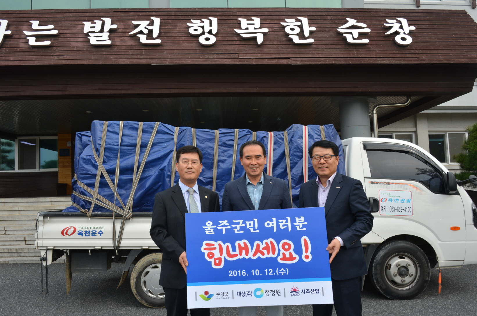 - 순창군이 태풍 차바로 인해 막대한 피해를 입은 울주군에 1,000만원 상당의 위문품을 전달해 울주군민들이 태풍피해를 극복하는데 도움을 줬다.위문품은 순창발효미생물산업진흥원, 대상(주)청정원, 사조산업(주)에서 기탁한 고추장 된장 쌈장 등이 현물로 전달됐다.울주군은 지난 5일 태풍 차바로 인해 삼동면에 시간당 최대 134mm씩 모두 319mm의 물폭탄이 쏟아지는 등 강풍과 폭우로 인한 인적 물적 피해가 커 정부로부터 특별재난지역으로 선포됐다. 특히 순창군과 울주군은 지난 2011년 문화교육 협약을 체결하고 장류축제 등 양지역 축제는 물론 다양한 부문에서 문화교류를 추진하고 있다.황숙주 군수는 “작은 정성이지만 태풍 차바 피해로 인해 고통 받고 있는 울주 군민들에게 이번 위문품 지원이 도움이 됐으면 한다” 며 “앞으로도 순창군과 울주군이 문화교류 확대는 물론 어려울 때 서로 힘이 될 수 있는 이웃같은 자치단체가 될 수 있도록 교류 협력을 확대해 나가겠다”고 말했다. 해당 게시물이 '사진으로 보는 군정'에서 이동 되었습니다.