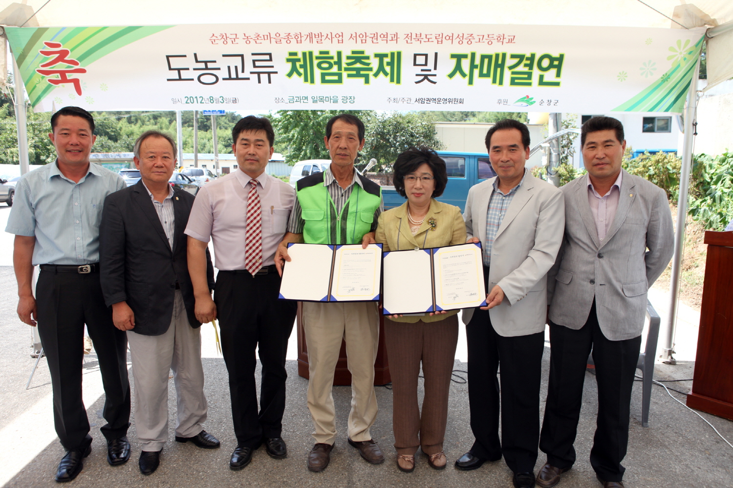 - 농민은 제 값에, 도시민은 믿을수 있는 농산물 구입! - 순창군 서암권역, 전북도립여성중고 자매결연으로 도농교류 활발 - 순창군 농촌마을종합개발사업지구인 서암권역(위원장 김진상)과 전북도립여성중고등학교(교장 홍성임)가 자매결연을 맺고 도농교류의 기반을 마련했다. 지난 3일 서암권역 일목마을 앞 광장에서는 서암권역 주민 100여명과 전북도립여성중고등학교 80여명, 관내기관 단체장 등 200여명이 참석한 가운데 자매결연식을 가졌다. 황숙주 순창군수는 축사를 통해 “이번 행사가 일회성이 아닌 두 단체가 지속적으로 만나서 기쁨을 나누고 도시와 농촌의 교류를 촉진하여 지역경제 활성화에 도움이 되는 행사로 이어지기를 바란다”고 당부했다. 또 김진상 서암권역 위원장은 환영사를 통해 “물좋고 공기 좋은 금과면 서암권역에서 생산되는 과일과 농특산물은 전국 어디에 견주어도 맛과 품질면에서 으뜸”이라면서 “농민은 땀 흘려 가꾼 농산물을 제값에 받고 팔 수 있고, 소비자는 산지에 가지 않아도 믿을 수 있는 농산물을 살 수 있는 이번 도농교류행사는 농촌마을종합개발사업의 성공적인 사례”라고 말하며, 앞으로 더욱 확대 추진하여 농촌을 살리는데 최선의 노력을 다할 것이라고 밝혔다. 또한 전북도립여성중고 홍성임 교장은 “이번 자매결연을 통해 도시와 농촌이 상호 협력체계를 유지하고 발전해 갈 수 있도록 서암권역의 농특산물 구매는 물론 앞으로 자주 서암권역을 찾아 도농교류행사를 추진하겠다”고 말했다. 한편, 자매결연식 후 이어진 복숭아따기, 두부만들기, 인절미만들기 체험 등은 서암권역의 다양한 친환경 농특산물 홍보는 물론 판매까지 연계되어 도시민들의 높은 관심과 함께 신뢰를 구축하는 계기를 마련했다. 순창군 서암권역은 금과면 남계리 호치.장장마을, 목동리 일목.이목.계전 마을 등 총 5개마을로 구성된 황토열매마을로, 배, 복숭아, 밤, 메론, 딸기, 고구마, 매실, 쌀 등을 주로 생산하고 있으며, 특히 황토밭에서 친환경으로 자란 금과배는 전국에서도 유명하다. 해당 게시물이 '사진으로 보는 군정'에서 이동 되었습니다.